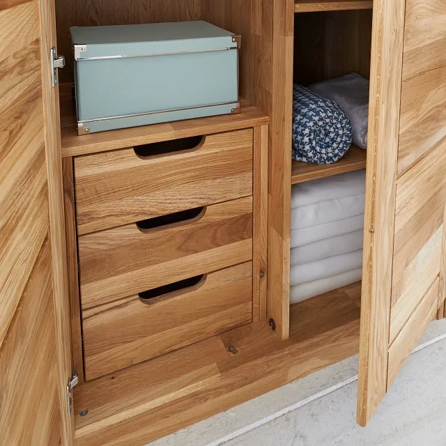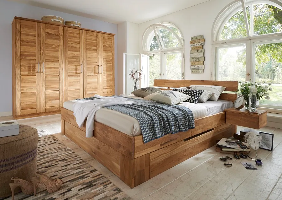 Die Fertigung diese hochwertigen und gleichzeitig preiswerten Schlafzimmers in massiver geölter Wildeiche, erfolgt in der Herstellung wie in der Herkunft des Holzes mit Nachhaltigkeit vor Augen.